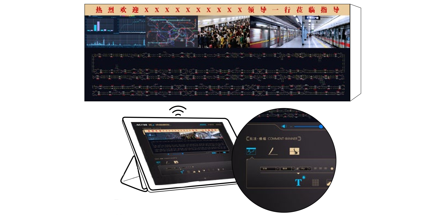 为满足上级领导来参观、外部人员学习时显示标语、欢迎词等要求,分布式可视化管控系统具备横幅展示功能,支持在会议中心或其他用房的任意显示墙的四周任意一边虚拟划分出横幅显示条,横幅内容支持固定文字、滚动文字、图片等形式,文字字体、字号、颜色等内容均可根据显示需求进行自定义调整,无需新增额外LED条屏设备或操作电脑。