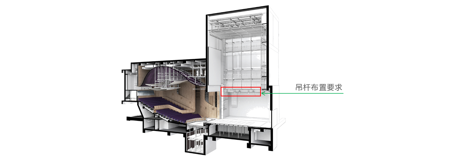 • 对于设有防护冷却水幕系统的剧场,吊杆的位置不应侵占防护冷却水幕系统的安装空间。