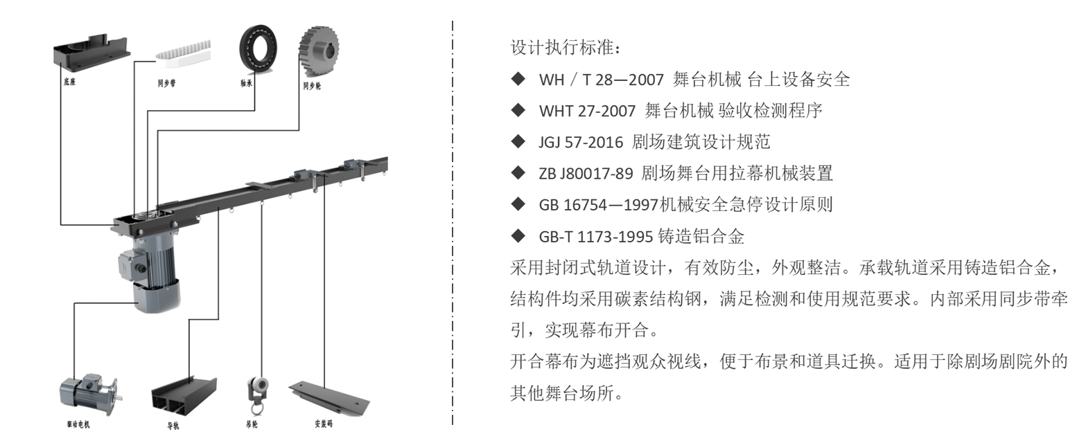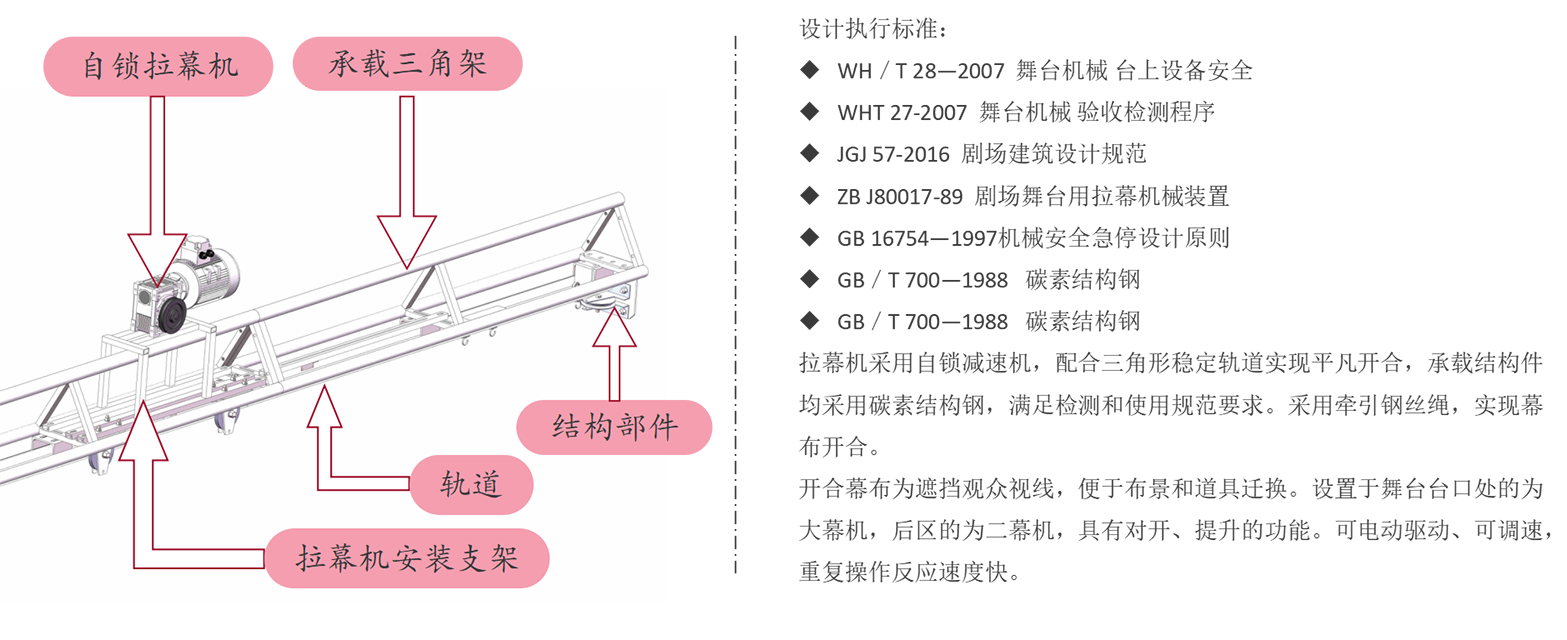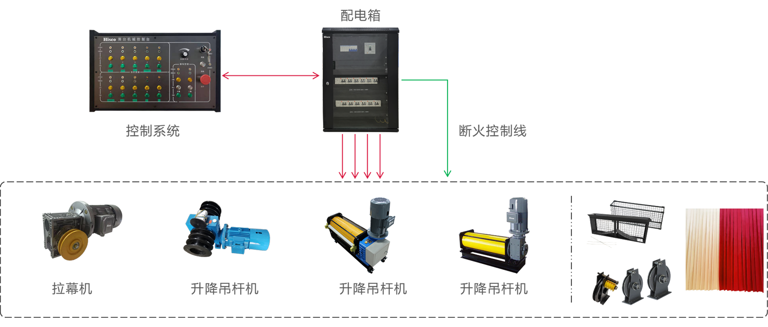这些设备包括但不限于台上机械、台下机械、升降舞台、伸缩舞台、旋转舞台、活动假台口、灯光吊笼、灯光吊片、对开系统、电影银幕架、升降系统、电动吊杆机等。