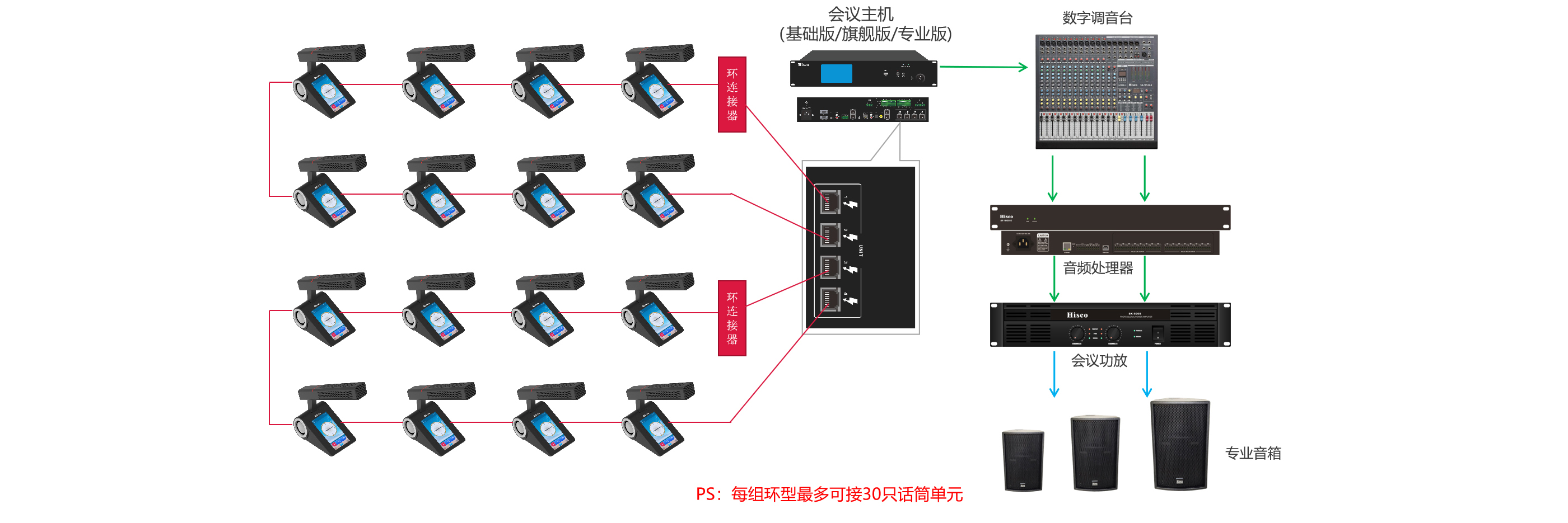 1.大容量接入 2.一键关闭所有无线单元 3.消防联动 4.摄像跟踪 5.发言模式